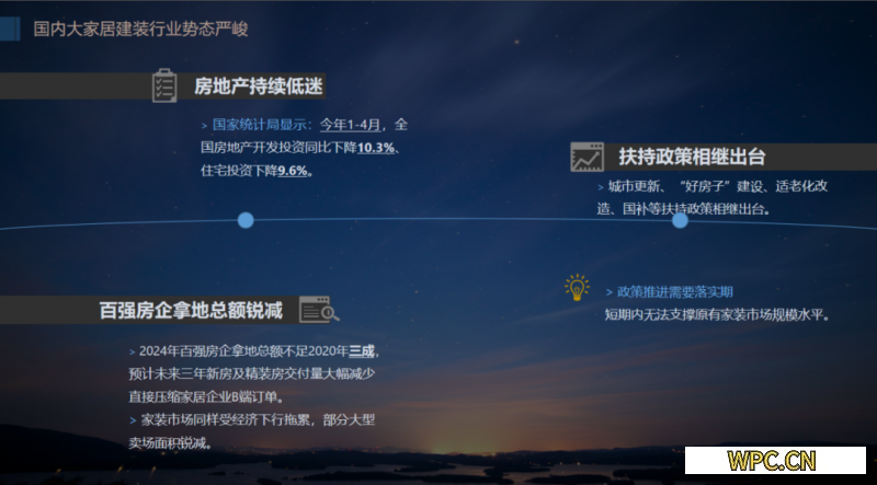 當前,國內市場的情況大家都很清楚。房地產持續低迷根據國家統計局數據,今年1-4月全國房地產開發投資同比下降10.3%、住宅投資下降9.6%。2020至2024年百強房企拿地總額銳減,2024年不足2020年三成。預計未來三年新房及精裝房交付量大幅減少,直接壓縮家居企業B端訂單,而家裝市場同樣受經濟下行拖累,部分大型賣場面積縮減。盡管城市更新、“好房子”建設、適老化改造、國補等扶持政策相繼出臺,但是短期內無法支撐原有市場規模水平。