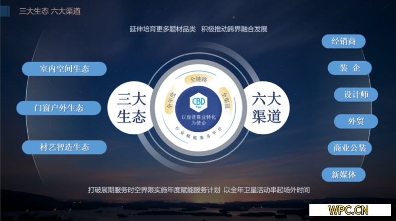 創新推出室內空間生態、門窗戶外生態、材藝智造生態三大生態,延伸培育更多題材品類,積極推動跨界融合發展;深化經銷商、設計師、裝企、外貿、商業公裝、新媒體六大渠道建設,打破展期服務時空界限實施年度賦能服務計劃,以全年衛星活動串起場外時間。
