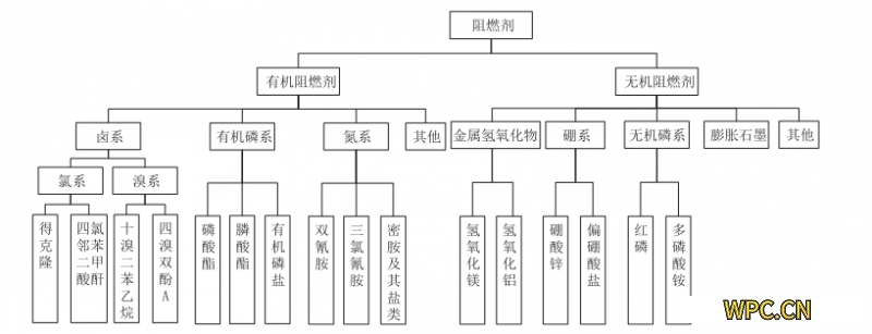 對塑木復合材料進行阻燃處理,使其達到相應的阻燃級別,可進一步提升其市場價值。近年來,關注阻燃劑與表面改性技術的協同作用,提高阻燃性能和效率已成為學術界研究的熱點。增強塑木復合材料阻燃性能的主要方法有3種:第1種,在生產前將木質纖維素類天然纖維與阻燃劑一起在高壓釜中浸漬;第2種,在復合材料生產過程中以液體或固體形式添加阻燃劑;第3種,在復合材料中加入無機納米顆粒。這3種引入阻燃劑的方法是最常見的方法,常用阻燃劑及其分類。