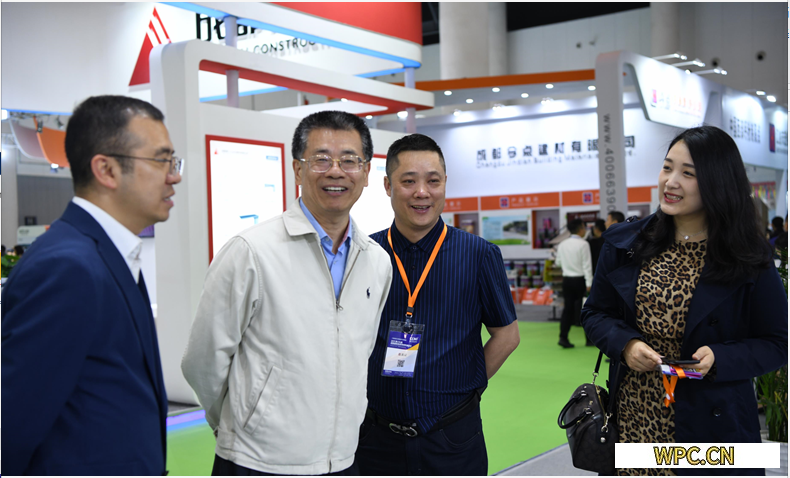2019年成都建博會(huì)現(xiàn)場(chǎng),展會(huì)項(xiàng)目副總經(jīng)理趙仕陽(右二)陪同中國建筑材料流通協(xié)會(huì)會(huì)長秦占學(xué)(左二)、中國建筑材料流通協(xié)會(huì)秘書長馮斯靜(右一)參觀展會(huì)