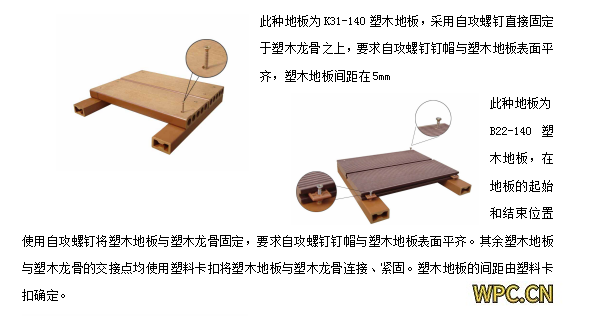 塑木地板的封邊使用塑木板材B10-140或B16-70進行封邊,根據地板龍骨的高度,將B14-140或B16-70裁制到需要的高度,固定封邊塑木材料的自攻螺釘間距在400mm~600mm。也可以選用其他金屬封邊條作為塑木地板的封邊。