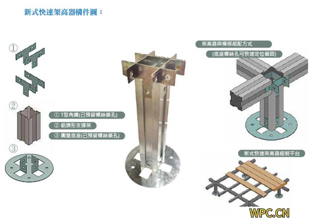 有鑒于一般平臺架高可能會產(chǎn)生的問題,有塑木公司獨創(chuàng)了的新式快速架高器組在使用上,則更能因應場地的狀況,提供更快速、有效與便捷的組裝以及更加有彈性的使用與調(diào)整。