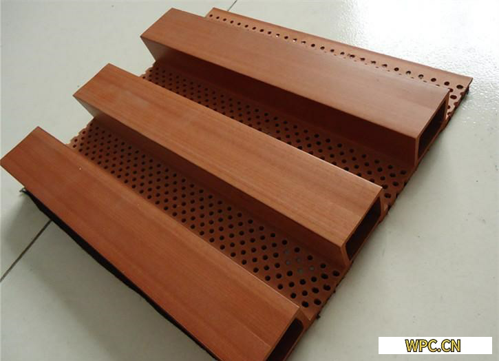 首先,在吸聲材料方面,充分利用多孔吸聲機(jī)理,在塑木復(fù)合材料的原料配比上進(jìn)行改進(jìn),使其達(dá)到內(nèi)部孔隙的相互貫通,提高其吸聲性能。與此同時(shí),可以通過仿效市面上常見的木質(zhì)穿孔吸音板的制備方法,對(duì)塑木復(fù)合材料進(jìn)行開孔與開槽的結(jié)構(gòu)設(shè)計(jì)。主要是以塑木復(fù)合材料為基材,在其表面與背面進(jìn)行開孔,從而得到開孔的共振吸音材料,表面開孔的形狀可以是圓形、條形、微孔形等,通過調(diào)節(jié)孔徑的大小、疏密程度和形狀以調(diào)節(jié)塑木復(fù)合吸音板的吸聲性能。背面開槽的方法主要是在塑木板材的背面進(jìn)行開槽,開槽的類型主要有弧形槽、梯形槽、方形槽等類型。開孔法可拓寬塑木復(fù)合材料的吸音頻段,提高其中高頻段的吸聲性能,增強(qiáng)塑木板材的裝飾性與吸聲性,但是產(chǎn)品的性能和工藝方面有待改進(jìn)和提高,在結(jié)構(gòu)上進(jìn)行孔槽型的研發(fā),使其一次性成型,避免多次加工,使其具有最佳的吸聲性能。