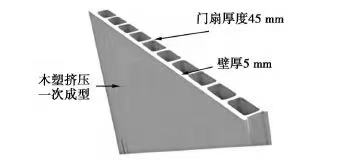 木塑門門扇大多采用擠出成型生產工藝,表面為熱轉印膜。熱轉印膜由基膠層、色膜層,以及表面UV層3層材料組成,經加熱后通過高溫加壓將轉印膜覆在門扇表面,基膠層熔化后可使色膜與材料融為一體,完成轉移印刷,其中,表面UV層起到固化和防紫外線的作用。在塑木生產過程中除少量粉塵和噪聲污染外,無廢氣、廢渣排放,冷卻水可以循環(huán)利用; 膠合媒介是熱塑性聚合物,產品生產過程中不需要另外使用膠黏劑,因此無甲醛等有害物質釋放。門扇的造型、肌理、色彩等均可通過設計模具和添加色料預設完成,其制品表面平整光滑,如果沒有特殊要求,不需要對制品進行裝飾和保護方面的二次加工。相對于傳統(tǒng)的木質門而言,木塑門的制造工藝和生產流程簡單,生產過程中能源消耗量低。生產工藝流程如下: 將熱塑性塑料/高聚物、木粉、填充料與其他功能型助劑放入高速混合機,組合均勻后經螺旋自動上料機投入到擠出機料斗,同時將擠出機溫度預先設定并保溫,經擠出機將原料熔融塑化后,通過專用模具擠出進入真空定徑裝置,冷卻定徑成型后再通過牽引機將其牽出,進入自動切割機按預先設定的長度實現(xiàn)自動切割至堆放架,然后將通過表面處理的合格產品入庫,次品及邊角料經粉碎、磨粉后可直接循環(huán)利用。木塑門剖面示例:
